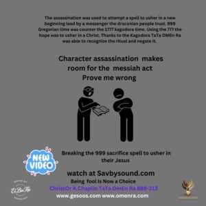 The assassination was used to attempt a spell to usher in a new beginning lead by a messenger the draconian people trust. 999 Gregorian time was counter the 1777 kagodora time. Using the 777 the hope was to usher in a Christ. Thanks to the Kagodora TaTa OMEn Ra was able to recognize the ritual and negate it.